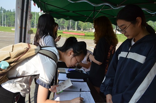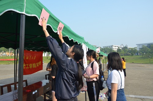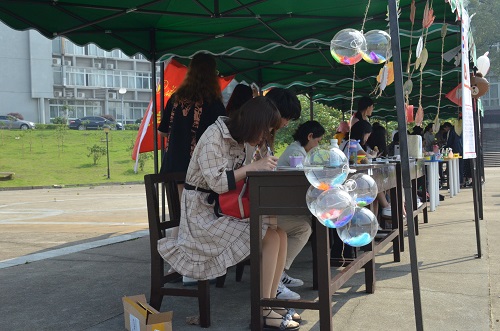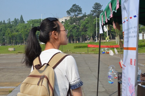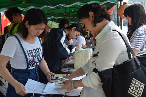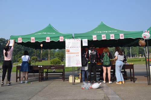 摆点值班人员齐心协力布置好现场后,便陆续有人前来询问。值班人员细致地向他们介绍活动内容,指导他们填信息表、写明信片,为他们将信件密封。活动参与者均可获得一次玩游戏抽奖的机会,投壶、颠乒乓球,小游戏趣味多;多肉、耳夹……各种各样的小礼物激起大家参与游戏的热情。