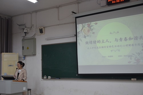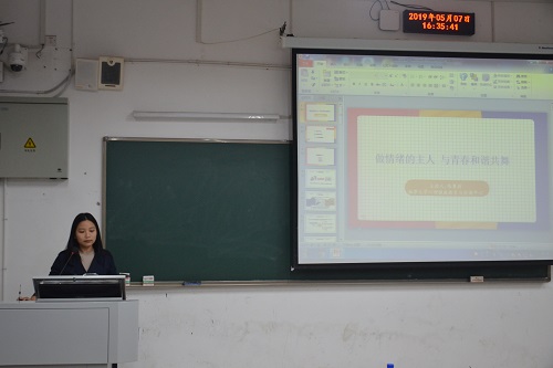 首先,夏妮老师简要说明了本次讲座的目的,向同学们介绍了主讲人陈蔓莉老师并邀请她上台为大家讲解。陈蔓莉老师为大家讲述了自己的小孩在摔倒后表现出的行为,以亲身经历引出了情绪这一主题。接着她从情绪的构成、情绪的意义等方面为大家具体介绍了“情绪”这一词语的概念。随后她从老员工常见的负面情绪出发,详细地为大家解说了应当如何面对自卑、冷漠、焦虑、愤怒、抑郁等一系列消极情绪。最后她讲到:“生活的不如意都会让我们产生负面情绪,我们要学会与之共存,发现情绪背后的秘密,做情绪的主人,让情绪处理成为我们健康成长的基石而不是绊脚石,与青春和谐共舞。”
