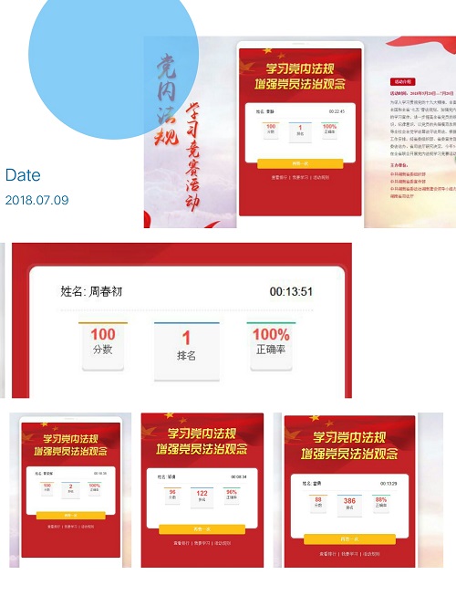 六是开展党内法规网上学习竞赛活动。7月6日—9日要求我支部各位党员参加学习党内法规增强党员法治观念的竞赛答题活动,支部全体党员全部参加,成绩优秀。