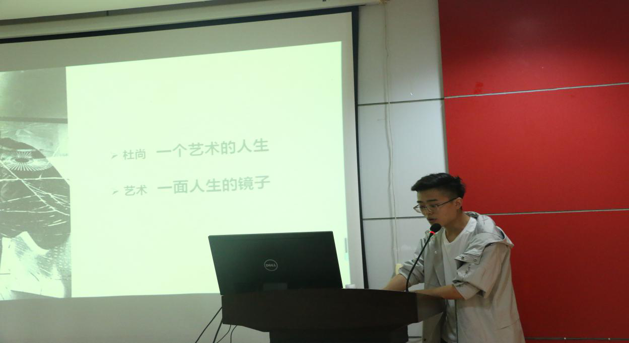 第三位演讲人是来自艺术公司的2017级硕士研究生——宋旭师兄,导师黎青教授,研究方向为艺术理论、艺术实践。曾公开发表论文2篇,参与课题4项,获得学术竞赛国家二等奖2项、三等奖2项、优秀奖4项,他演讲的题目为《马赛尔·杜尚,艺术的自由与叛逆》,给我们进行了一次艺术的洗礼。通过他的演讲,在场的同学们了解到一位有着高尚情操的艺术家—杜尚,他个性但不张扬,不为世间凡俗所束缚,不争不抢,不建立流派,将自己的一生奉献给自己热爱的艺术事业。师兄从杜尚的有名的画作入手,通过其画作的特点和创作的中心思想讲述了杜尚画作风格的变化无常,大众对其画作的评论以及他自由的一生,从而间接向大家表达了自己某些方面的人生观和艺术观。提问环节有同学问他既然这么了解杜尚,是否自己和杜尚的人生态度一致,并且希望他向大家说些可以提升自己艺术细胞的方法。师兄谦虚地说他只是欣赏杜尚的人生态度,欣赏他一生都在做一个身心自由的人,并有一个行云流水的人生,希望通过他向大家传递自由的理念;同时师兄说提升艺术细胞不需要方法,生活处处是艺术,画画是一种艺术,做实验也是一种艺术,借用约瑟夫·博伊斯的话:“人人都是艺术家”。大家纷纷鼓掌对他的话语表示赞同。他的演讲深深的感染了大家,两个评委老师说他们虽然也不懂艺术,无法点评,但是认为这样不同学科的讲座交流非常好,有助于我们转变思维,看待问题从多角度思考等。宋旭师兄的演讲在一片鼓掌声中结束了。