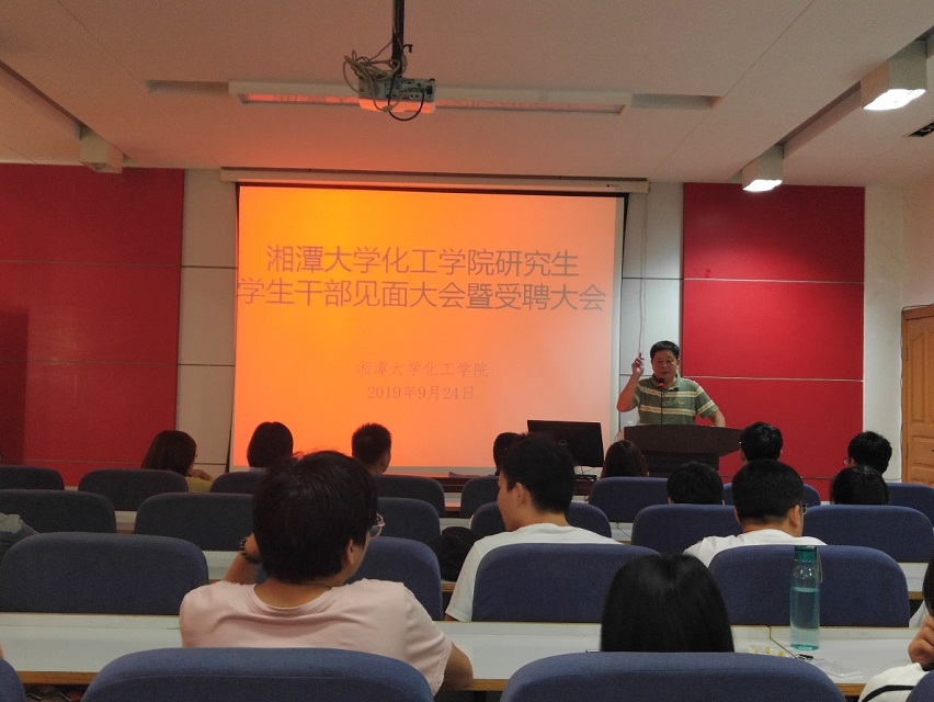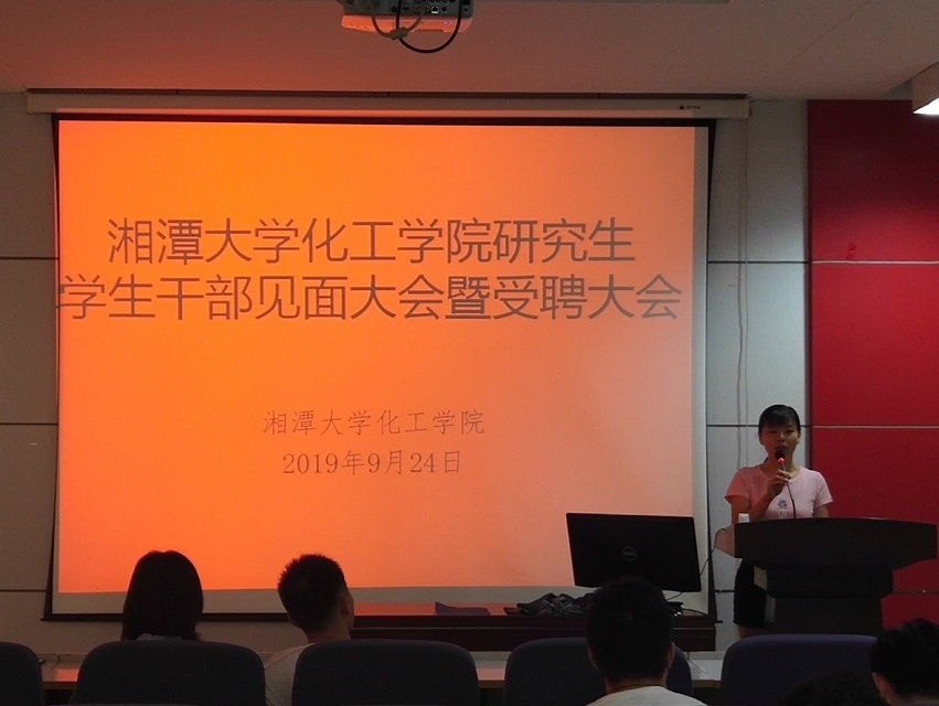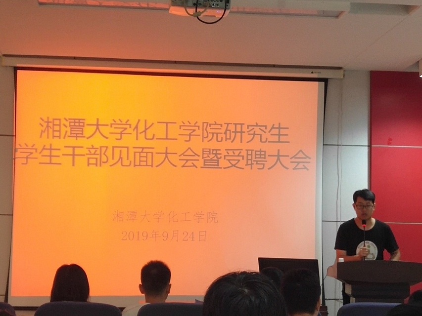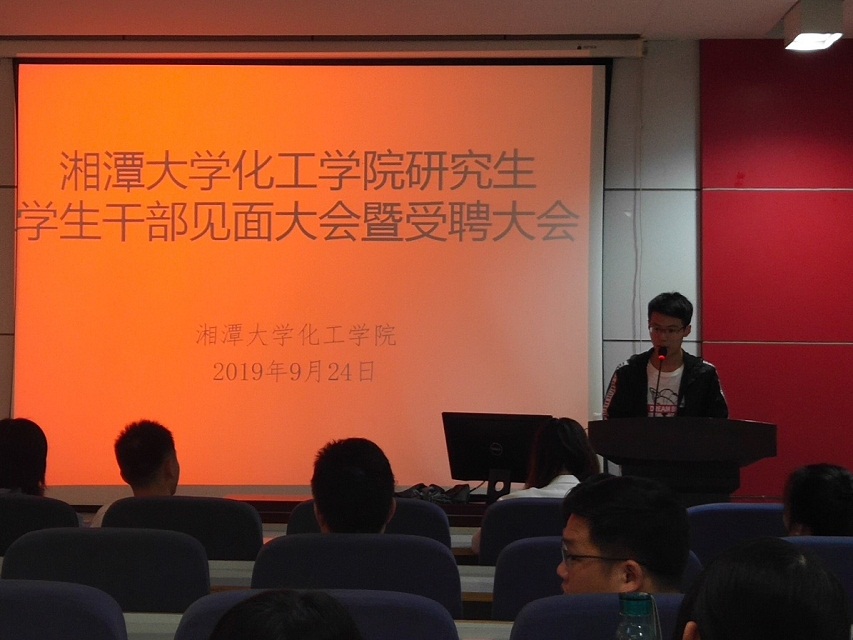 2019年9月24日上午九点2019级研究生干部见面大会暨受聘大会在化工大楼A208报告厅如期举行,此次大会由研究生会荣誉主席张永华和主席兰学东主持,同时谈球吧陈非文党委书记、雷勇老师和黄静老师及2019届研究生会各位同学出席了本次大会,此次大会共分为主持人发言、老师致辞、受聘仪式、各部门部长工作规划四个环节进行。