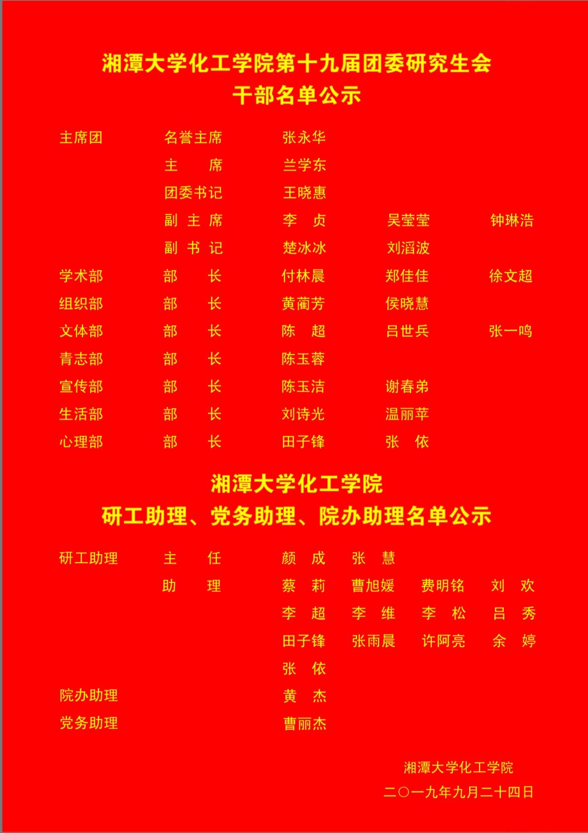 谈球吧第十九届研究生团委研究生会干部、党务助理、研工助理、院办助理公示名单