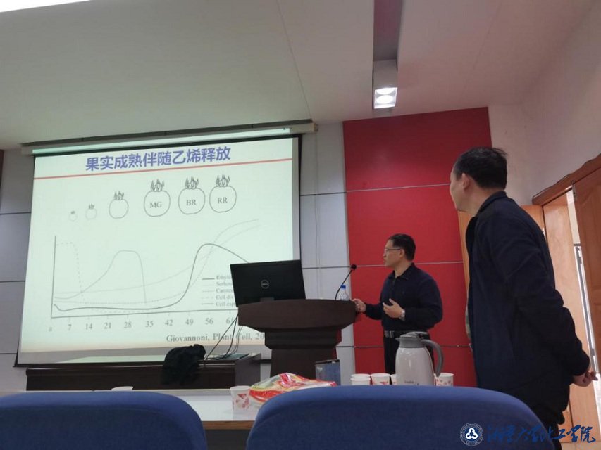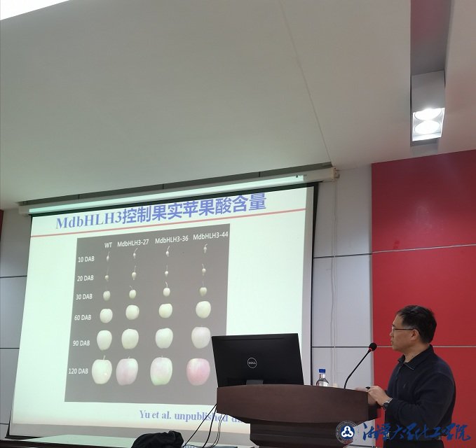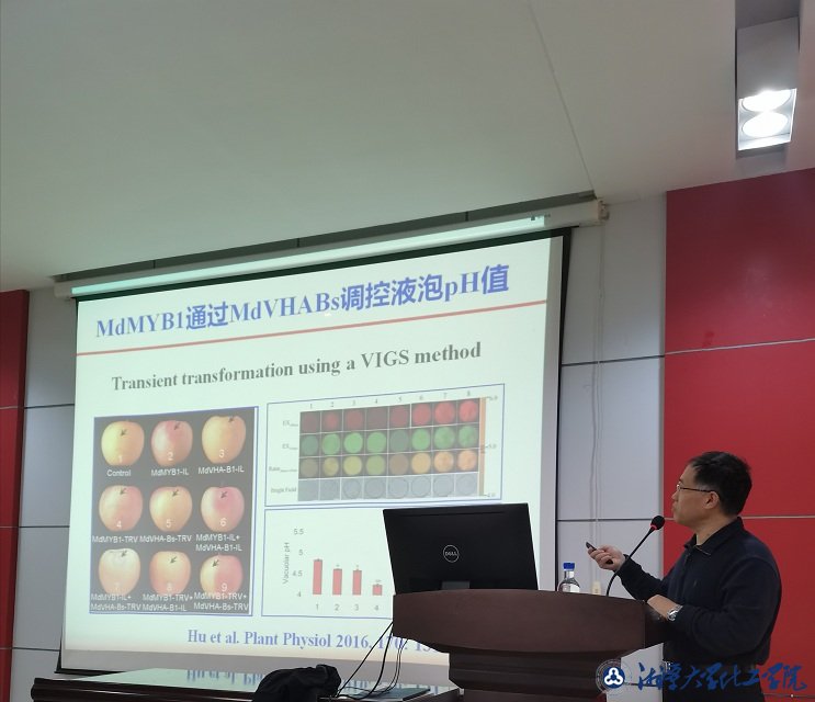 郝教授汇报结束后,大家都踊跃提问,其中有同学提问到:如何发现的这些转录因子,郝教授回答:通过现有的植物中所发现的因子,进行同源克隆最终发现其可以在苹果果实中起到作用。对于其他同学提出的问题郝教授也都耐心地进行解答。