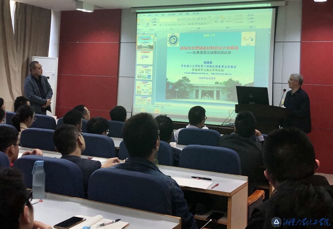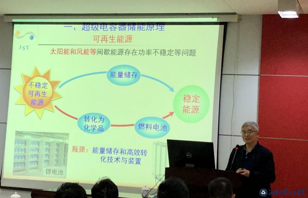 刘洪来教授此次报告的课题为超级电容器储能材料的设计和筛选。主要从超级电容器的储能原理、电极材料的设计、电解质的筛选以及密度泛函理论四个方面展开了介绍。在面对可再生能源的不稳定储存转化等问题上,通过将其转化为化学燃料电池变成稳定的能源,从而提高了对可再生能源的利用。此研究为推动社会的发展提供了强大的力量。在这一过程中,充分体现出了刘洪来教授对科学研究的热忱,对实验的严谨态度以及他深厚的理论依据。