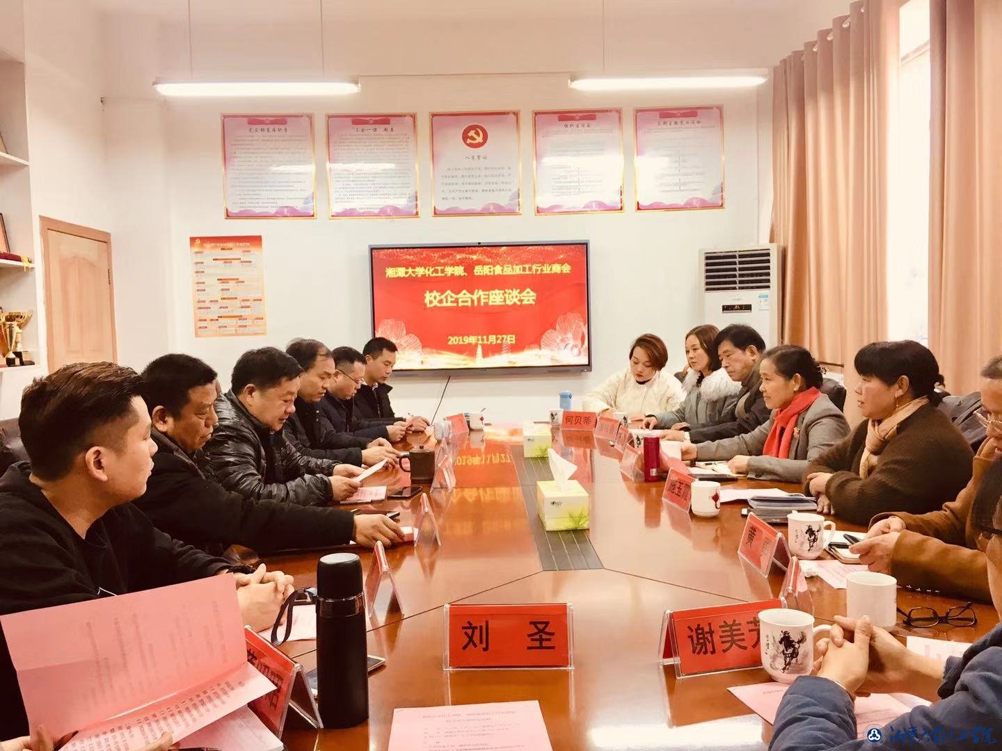 11月27日下午,岳阳食品加工行业商会与公司校企合作座谈会在化工大楼A201会议室举行。岳阳市工商业联合会主席何祚云、岳阳市食品加工行业商会秘书长张明星,公司党委书记陈非文、副书记周春初,副经理陶能国、游奎一等出席座谈会。会议由陈非文主持。