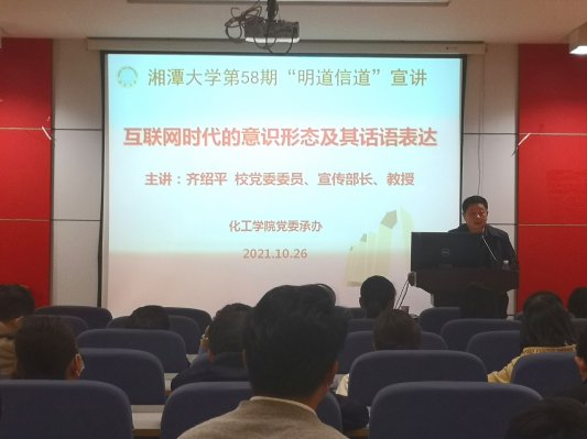2021年10月26日,公司党委在化学化工大楼A208学术报告厅承办了公司第58期“明道信道”师德师风建设宣讲会。公司党委委员、宣传部部长齐绍平教授应邀作了题为“互联网时代的意识形态及其话语表达”宣讲报告。公司全体教职工参加会议,公司党委书记陈非文主持。
