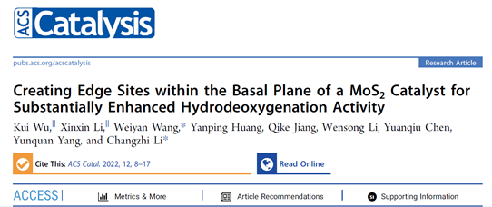 近日,谈球吧王威燕教授团队与中国科公司大连化学物理研究所合作在高活性加氢脱氧催化剂的构筑及反应性能研究方面取得重要进展,研究成果“通过在二硫化钼Basal面制造边缘位点有效提高催化剂的加氢脱氧活性”在催化领域顶级期刊《ACS Catalysis》(ACS Catal., 2022, 12, 8−17)上发表。公司青年教师仵奎为第一作者,王威燕教授和中国科公司大连化学物理研究所李昌志研究员为共同通讯作者,谈球吧为第一通讯单位。